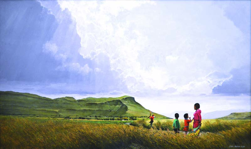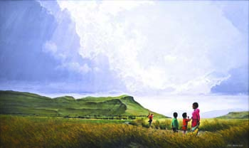D670 | The Grass Cutter Description Acrylics on Canvas | 900x1500mm /35,4×59,05 inches A grandmother trying to earn some income. Cutting grass to thatch a hut is a daunting task to help feed her family. Interested? Contact the Artist
